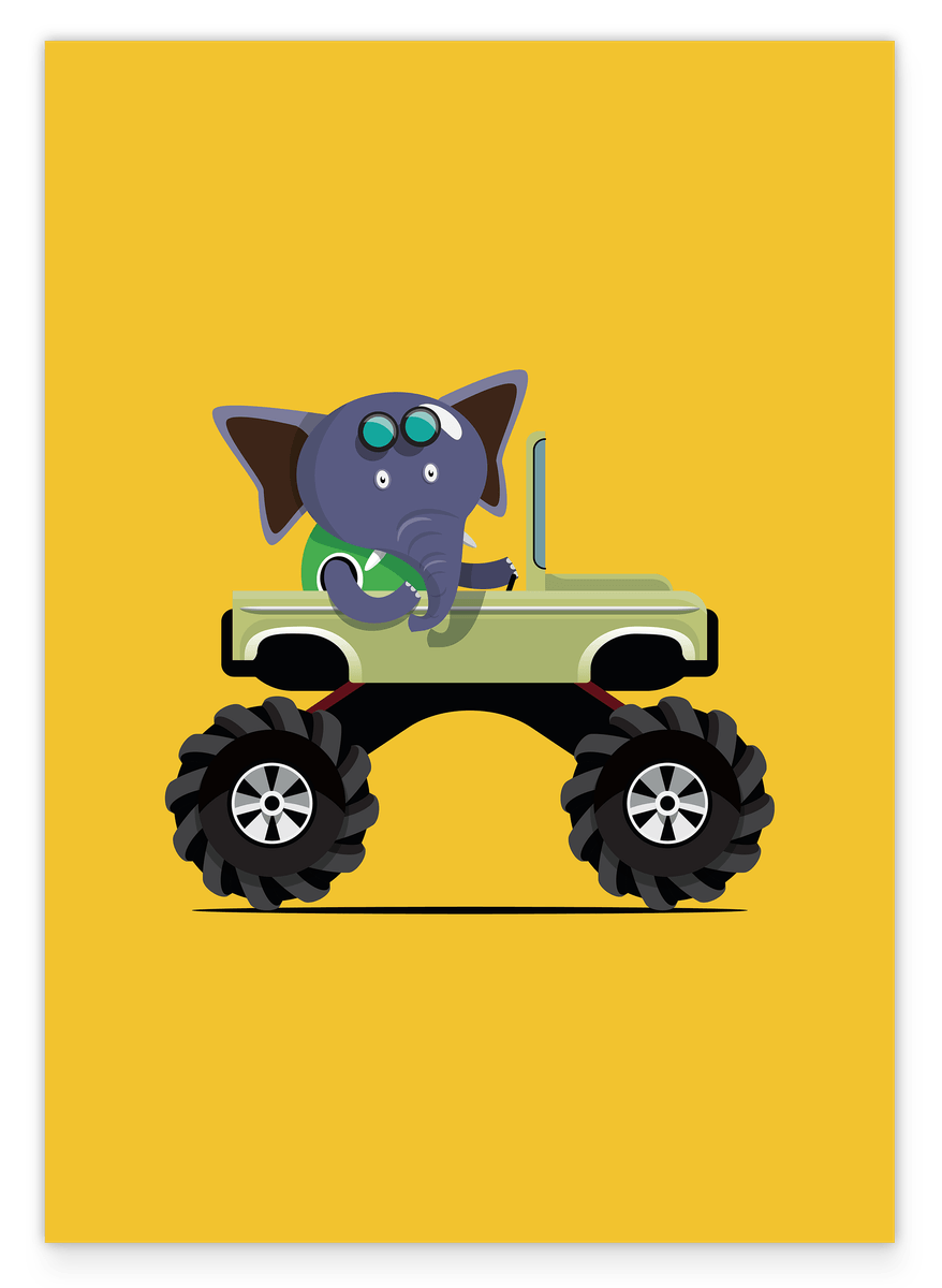 Emil Elefant, Auto-Zeichnung, Monstertruck, Lustige Illustration für Kinder, Bunte Dekoration für Zuhause
